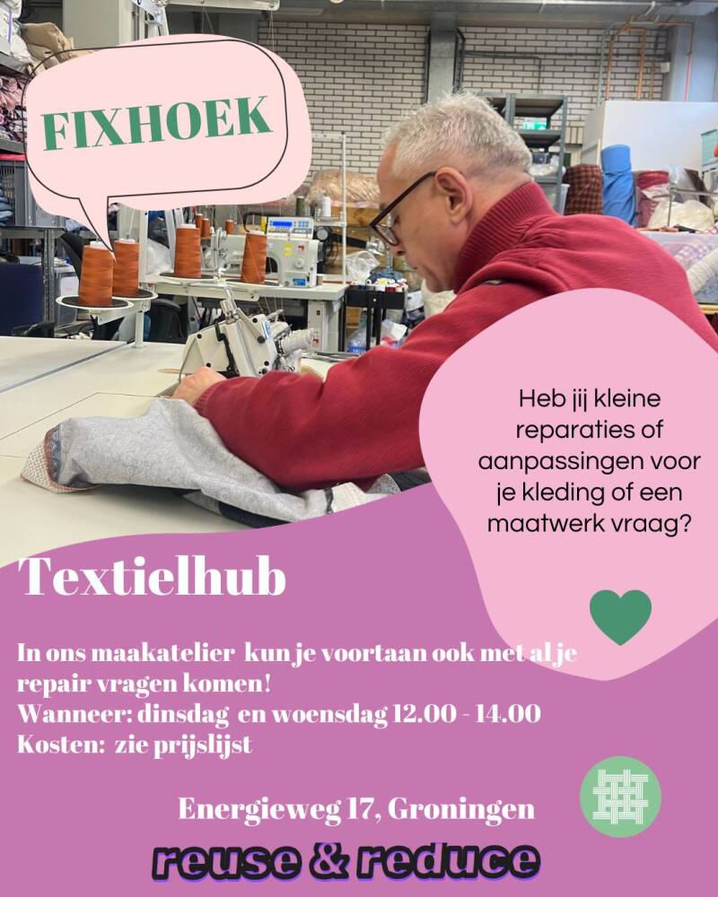 Iedere dinsdag- en woensdag tussen 12-14 uur kun je je kapotte kleding komen brengen bij de Textielhub.