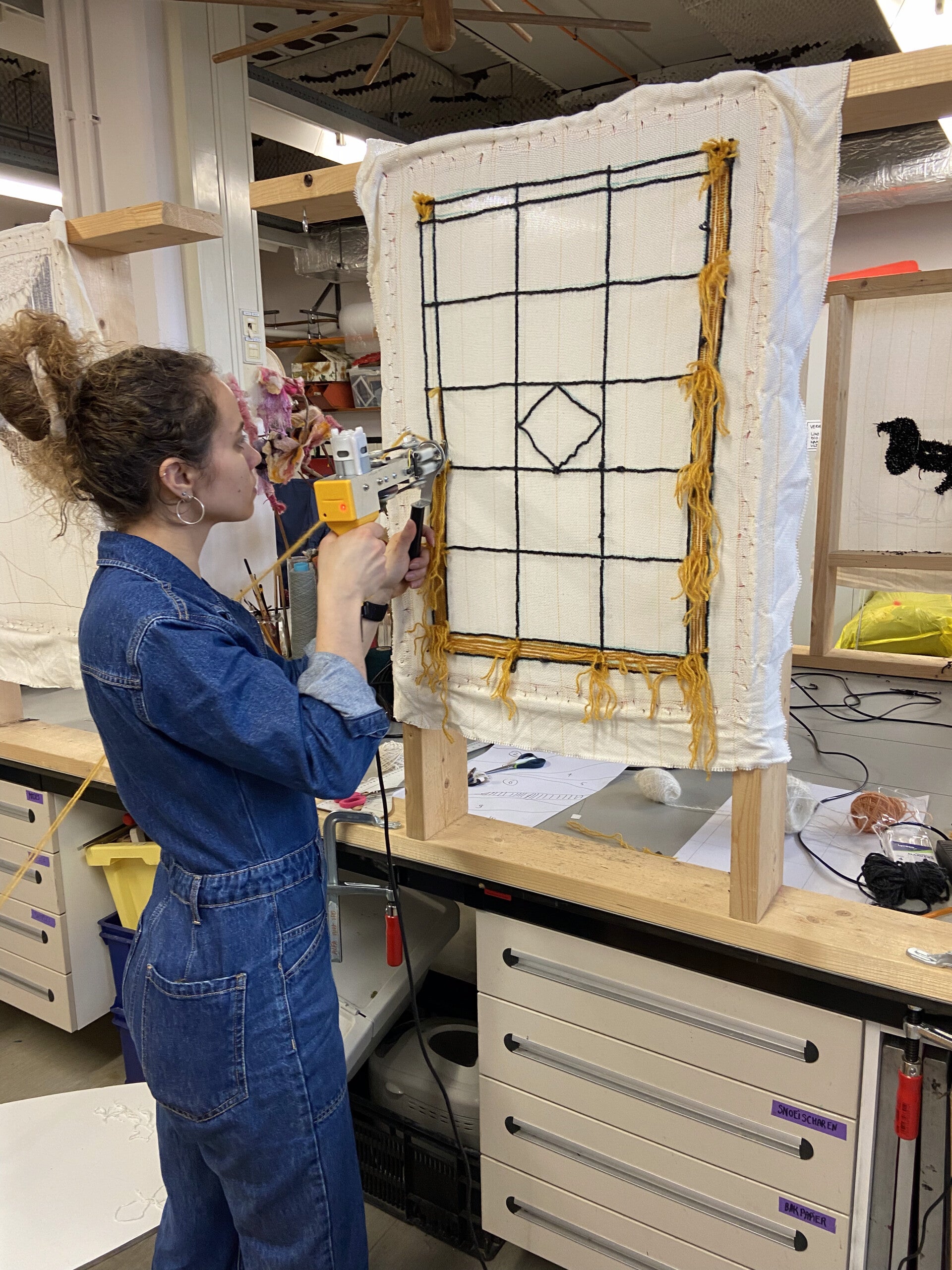 Op 7 maart gaf Rixt de Boer een superleuke workshop tuften. Na de uitleg gingen we aan de slag met een berg restjes wol/garen/ omtruigaren. Ieder schetste zijn eigen ontwerp op het tuftdoek en ging aan de slag met een tuftgun. Na wat oefenen, uithalen en opnieuw beginnen ging het best goed. Na 4 uur waren de armpjes moe en besloten we op de open dag nog even verder te tuften om ons werkstuk af te maken.