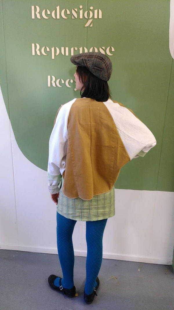 Dit ontwerp van Groningen Werkt Circulair is een remake van gebruikte stoffen, die nog graag gedragen willen worden. Wij hebben er twee uur maakwerk en liefde in gestoken. Draag me vol trots, repareer mij, geef mij door!